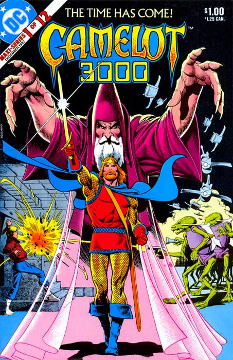 In Camelot 3000, perhaps the best known of Arthurian comic book series, Barr and Bolland tell of Arthur's return in the year 3000. As earth is invaded by aliens from outer space, Arthur is awkened from a centuries-long sleep in Glastonbury, Merlin is freed from Nyneve's spell holding him prisoner at Stonehenge, and eight knights, along with Guinevere, are discovered to have been renicarnated in this time. Lancelot is a wealthy French businessman and Guinevere is the commander of Earth's armed forces, while the other knights have returned in a variety of untraditional forms -- Gawain is African, Galahad is Japanese, and Tristan is a woman. The restored Knights of the Round Table soon learn that their old adversary Morgan Le Fay has also survived the centuries and is, in fact, behind the alien invasion. Morgan allies herself with Mordred, who has been reincarnated as the United Nations' Security Director. Lancelot and Guinevere resume their illicit affair, Merlin is again betrayed to Nyneve, and Perceval searches for the Grail, as the old story plays itself out once more.